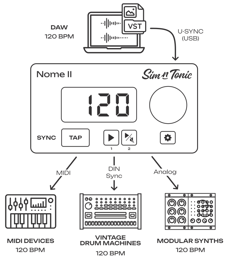 The Nome is a sync clock for electronic instruments, live musicians, and DAWs. Set the tempo, press play, and hear how everything is magically in time.